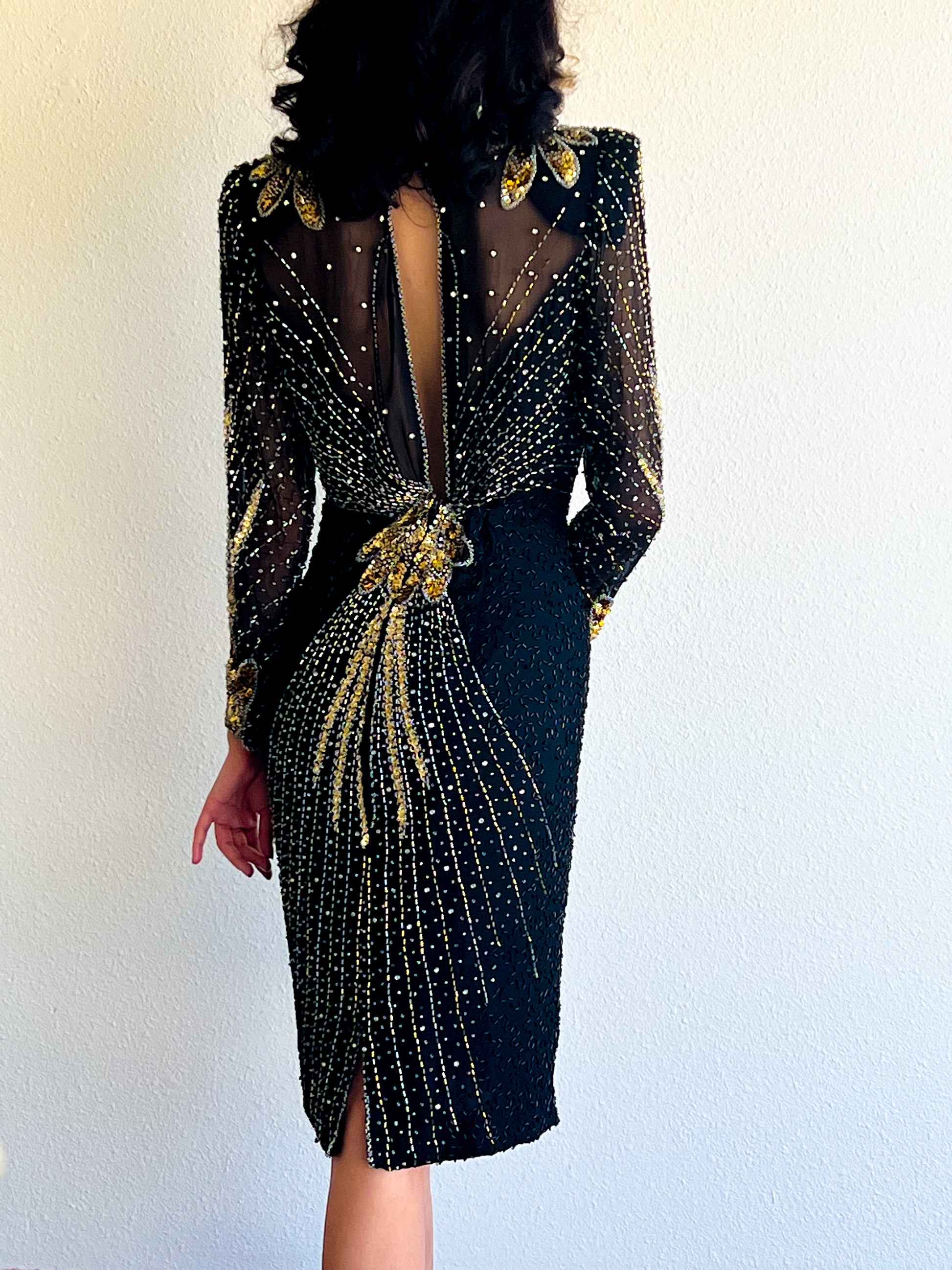 1980s Deco inspired, Black Chiffon Cocktail Dress with slight shoulder pads and silk lining. Elaborate hand-sewn beading, hand-set rhinestones, and gold sequins. Long back zipper with hook and eye closure at neck. Sheer sleeves with hidden snap button closure.